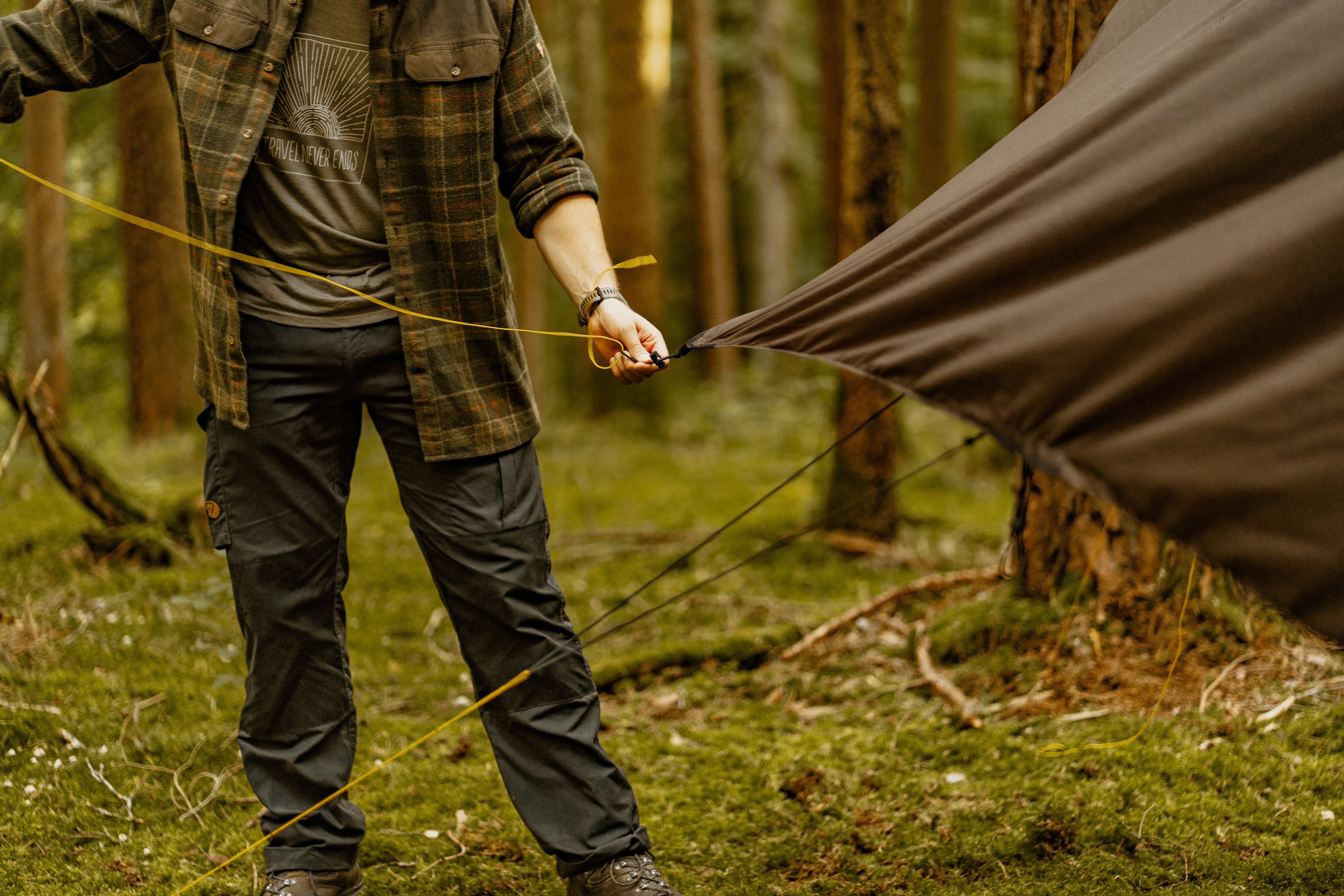 Gefertigt aus leichtem und formstabilem 20D Silpoly bleibt es auch bei Feuchtigkeit straff und zuverlässig. Alle zehn Abspannpunkte sind sorgfältig verstärkt, gesäumt und mit kleinen, leichten Metallringen versehen, um maximale Haltbarkeit zu gewährleisten. So behält das Wing Tarp seine Form – selbst bei starkem Wind.
